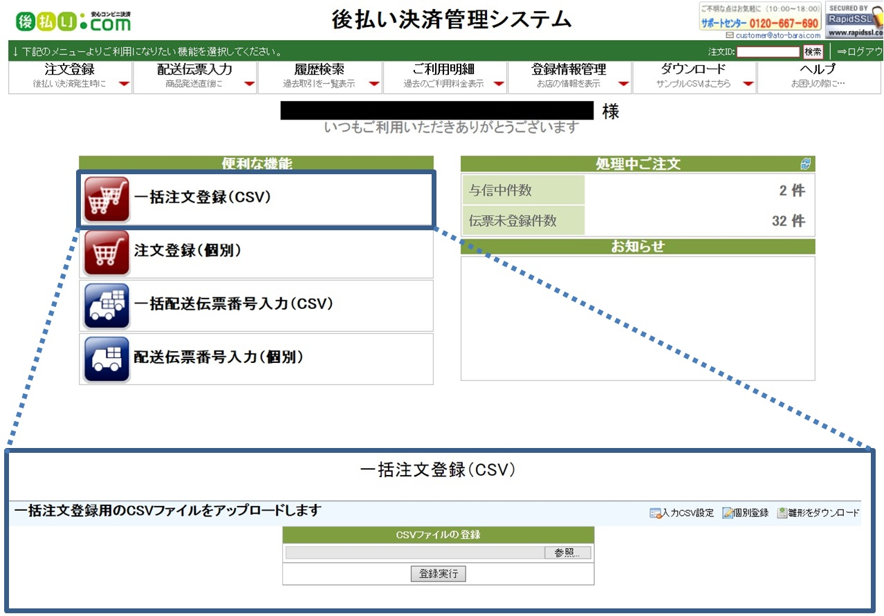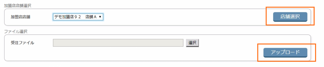一括注文登録(CSV)画面にて①にてダウンロードされたCSVデータを参照、登録実行を行います。