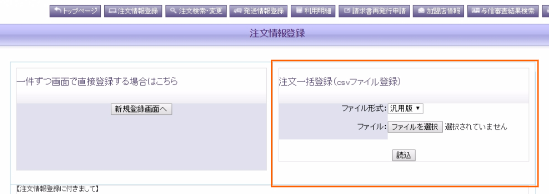 注文情報登録>注文一括登録(csvファイル登録)>ファイル形式:汎用版>ファイルを選択 からダウンロードしたCSVデータ