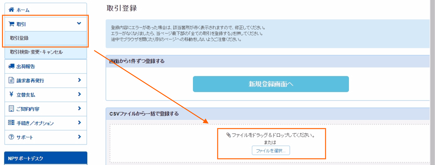 取引>取引登録>ファイルを選択 からダウンロードしたCSVデータ「order_pay_np_yyyymmddhhmmss.csv」を取込