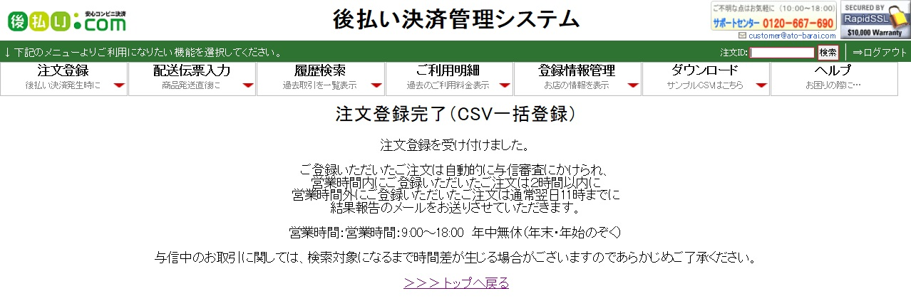 ④注文登録完了(CSV一括登録)の画面が表示されたら完了です。