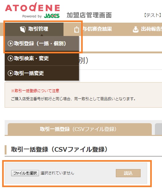 ファイルを選択 からダウンロードしたCSVデータ「order_pay_atodene_yyyymmddhhmmss.csv」を選択>読込