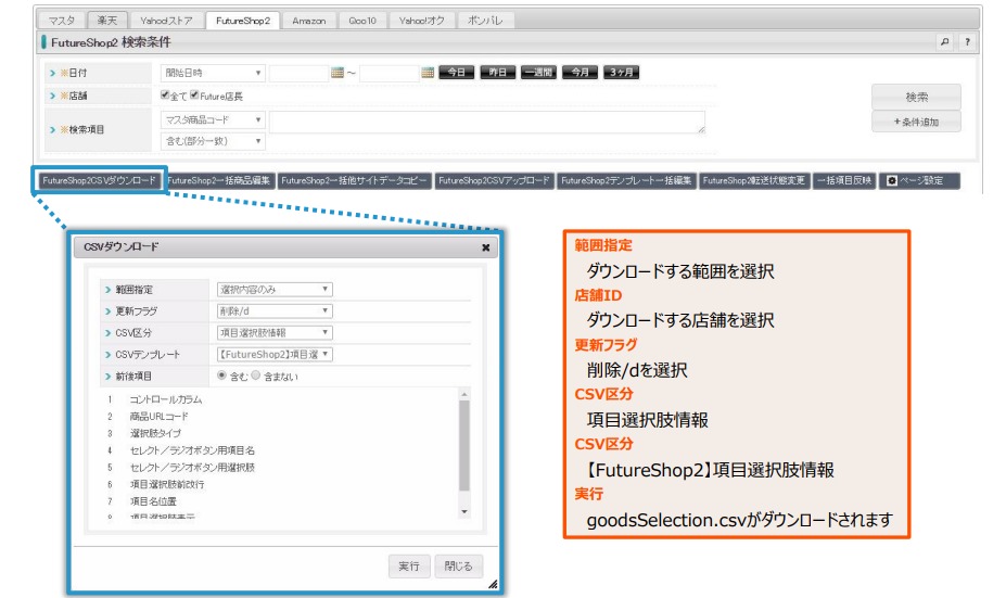 EC店長内を編集する前に、選択肢を削除するためのCSVのアップロードを行ないます。